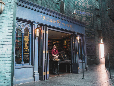 Step into the front of the cozy store, filled floor to ceiling with wands, and you’ll soon be greeted by the Ollivanders’s wandkeeper. If you’re lucky, you may be selected to be chosen by your unique wand!